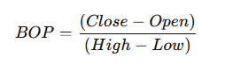 BOP is calculated using the formula: BOP=(Close−Open)(High−Low)BOP = \frac{(Close – Open)}{(High – Low)}
